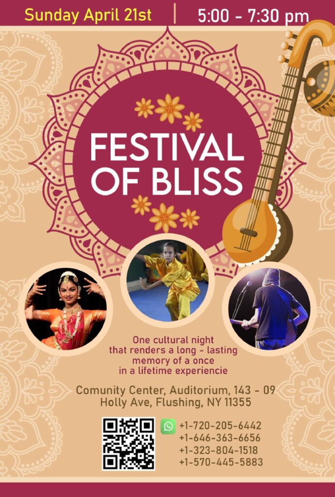 Past EventsFestival of Bliss NYC 2024The Festival of Bliss is an annual International Music and Cultural Festival organized by Ananda Marga members in the New York City area.Visit the festival website for more information.Spread the love